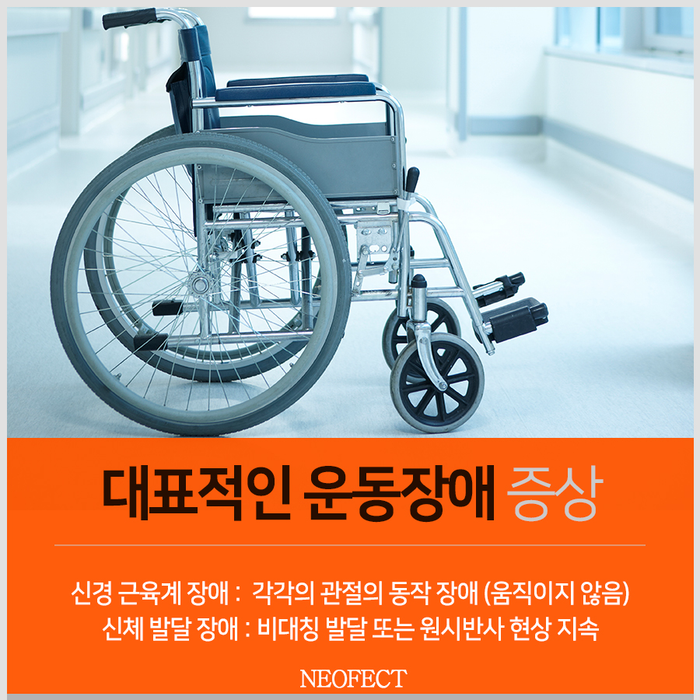 목의 위치에 따라 좌우 팔다리의 비대칭적 양상이 발생하게 되거나, 상/하지의 근육 긴장의 변화가 강하게 나타나는 원시 반사가 지속됩니다.